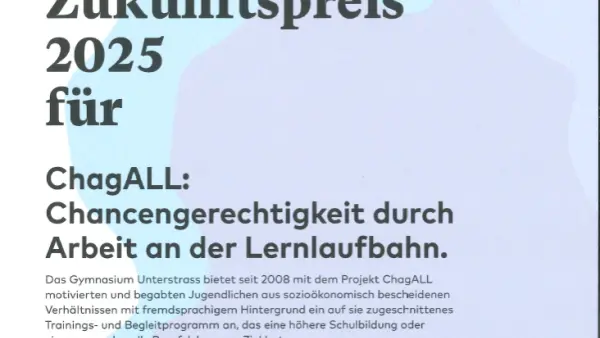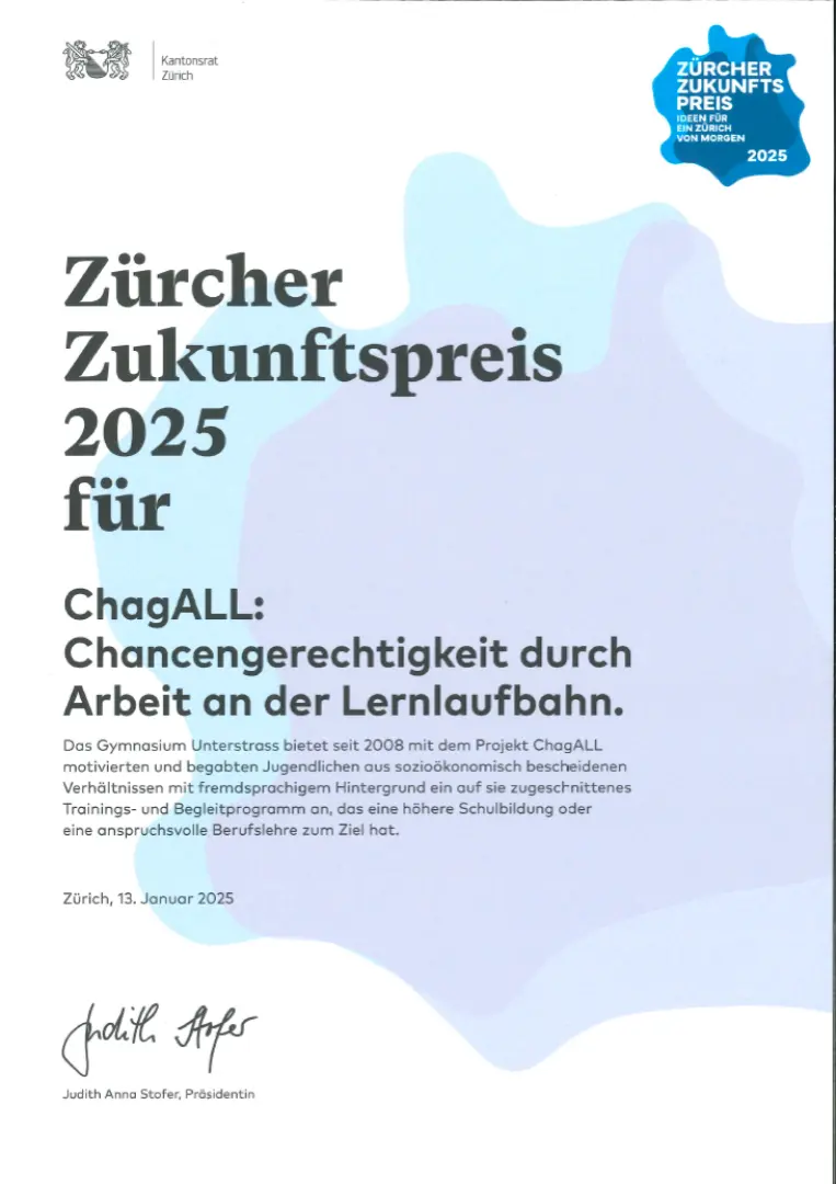 Wir freuen uns sehr, dass unser Programm ChagALL («Chancengerechtigkeit durch Arbeit an der Lernlaufbahn») mit dem «Zürcher Zukunftspreis 2025» geehrt worden ist. Dieser Preis würdigt die Arbeit, die seit 2008 vom ChagALL-Team geleistet wird, und wird hoffentlich dazu beitragen, den Fortbestand des Programms zu sichern.